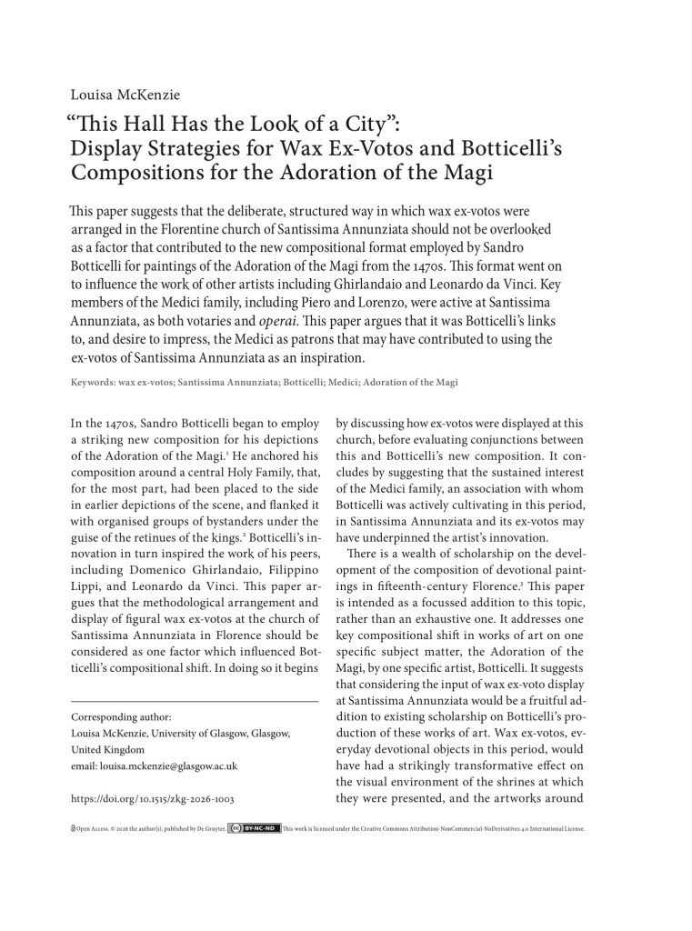 My first book, Re-materialising the Florentine Wax Ex-Voto: Production, Acquisition and Use between 1300 and 1500, is under contract with De Gruyter.